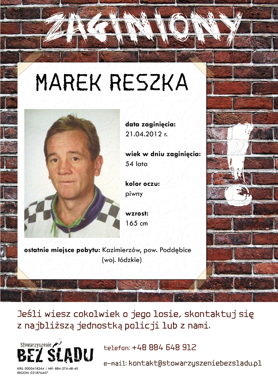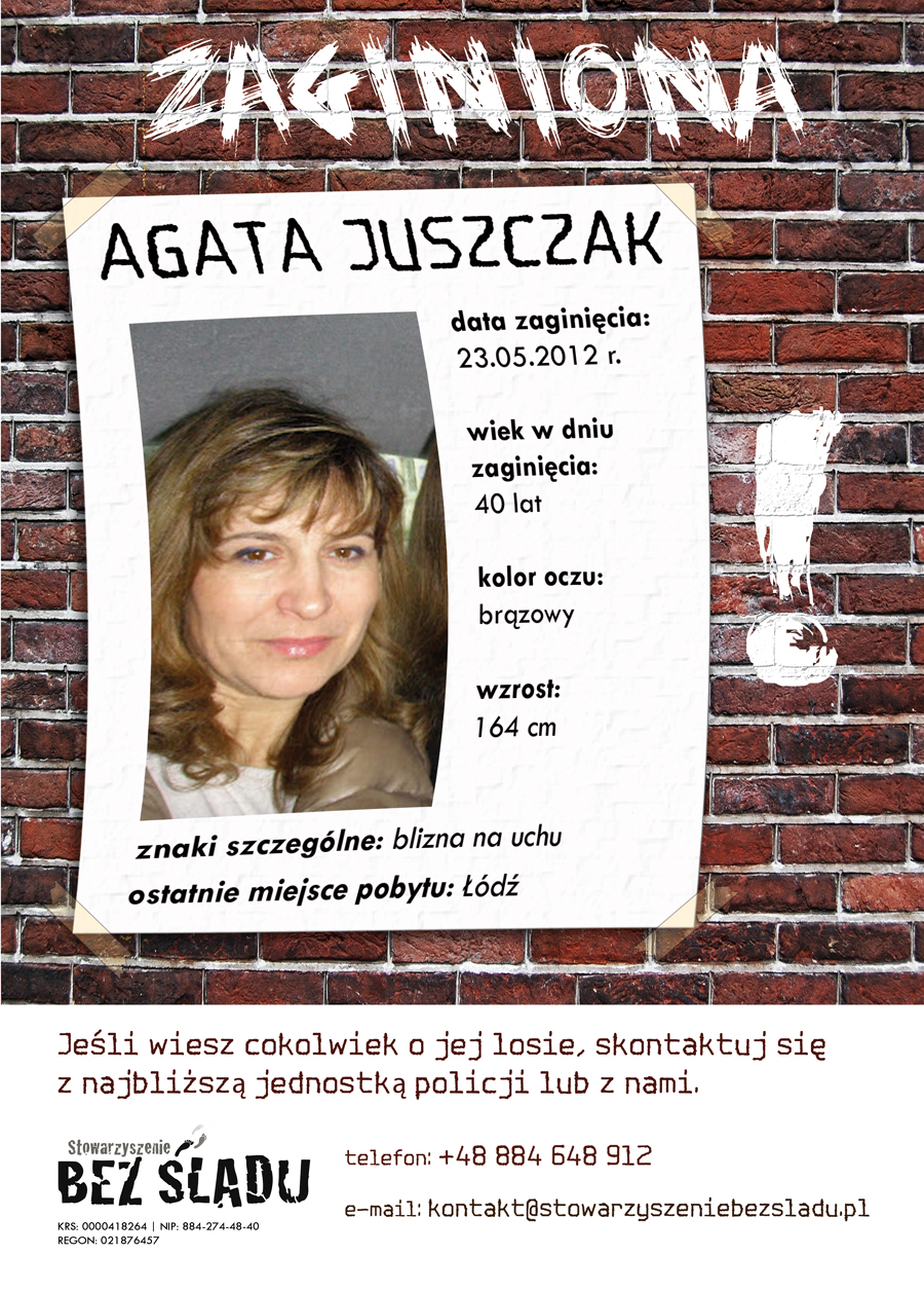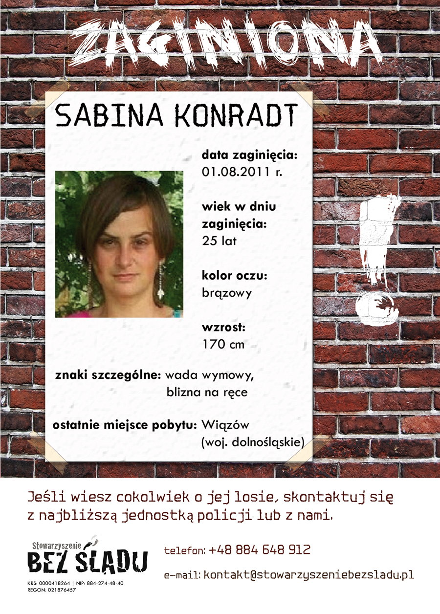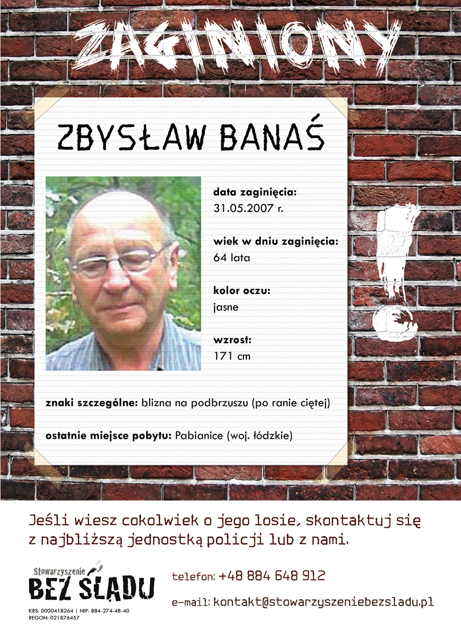 Stowarzyszenie Bez Śladu - jest efektem naszych prywatnych przeżyć związanych z zaginięciem bliskiej osoby.Dzisiaj jesteśmy jedynym stowarzyszeniem osób które organizują się wirtualnie i działają na całym świecie.Służymy rodzinom osób zaginionych nie tylko pomocą w nagłośnieniu i doprowadzeniu do skutecznych poszukiwań ale także naszym doświadczeniem osobistym. KRS: 0000418264. Kontakt: 884 648 912 kontakt@stowarzyszeniebezsladu.pl