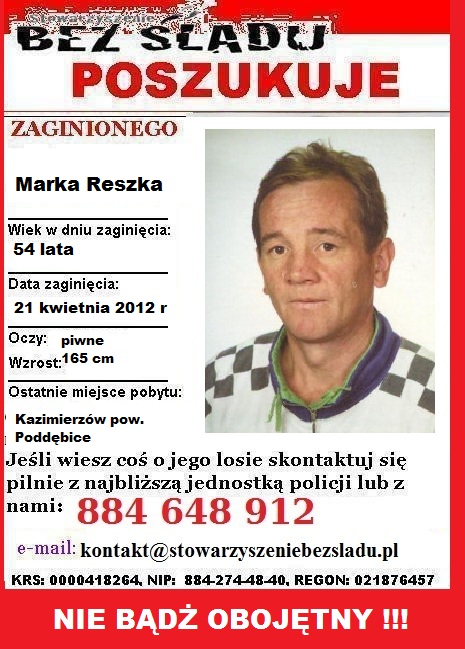 Pan Marek w dniu zaginięcia skontaktował się z córką, aby powiedzieć jej, że wyprowadza się od konkubiny i wieczorem tego samego dnia pojawi sie w Łodzi. Od tamtej pory nie wiadomo co się z nim dzieje. Telefon pana Marka nie odpowiada od kwietnia.