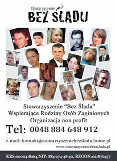Stowarzyszenie Bez Śladu - jest efektem naszych prywatnych przeżyć związanych z zaginięciem bliskiej osoby.Dzisiaj jesteśmy jedynym stowarzyszeniem osób które organizują się wirtualnie i działają na całym świecie.Służymy rodzinom osób zaginionych nie tylko pomocą w nagłośnieniu i doprowadzeniu do skutecznych poszukiwań ale także naszym doświadczeniem osobistym. KRS: 0000418264. Kontakt: 884 648 912 kontakt@stowarzyszeniebezsladu.pl